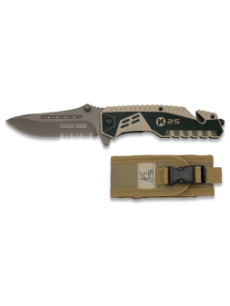 Navaja K25 18485 seguridad: Navaja de SEGURIDAD K-25 con mango de aluminioy hoja de acero inox con baño de titanio de 9 cm de longitud y 3 mm de grosor. Incluye punta rompe-vidrio, cutter corta-cinturón doble y funda de nylon.